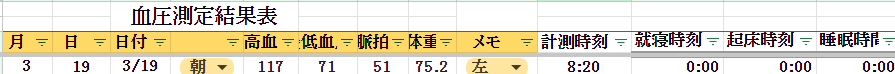 今日の体重と血圧と睡眠時間の測定結果