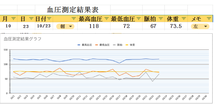 上の血圧が118、 下の血圧が 72、 脈拍が67 、 体重が73.5kg 。