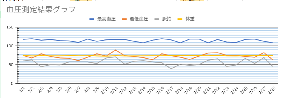 これを見ると最高血圧は安定しているが、最低血圧と脈拍の乱高下が激しいことがわかります。
