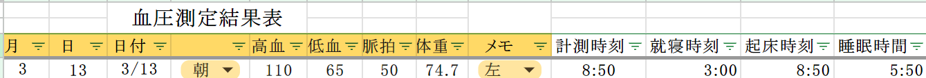今日の体重と血圧と睡眠時間の測定結果